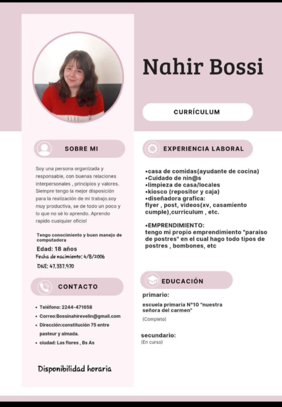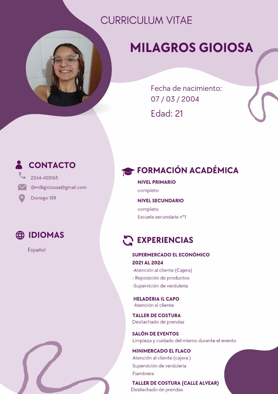 Secundario en curso Municipalidad área deportes y limpieza 31 años Dirección: Caseros 575 Las Flores Tel.: 2244448429